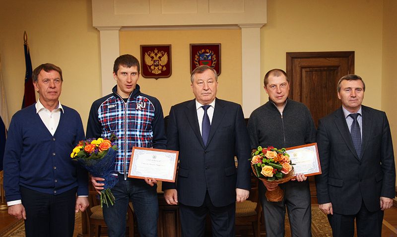 Губернатор Алтайского края Александр Карлин встретился с чемпионом мира Андреем Соболевым и его тренером Дмитрием Фоминых.
