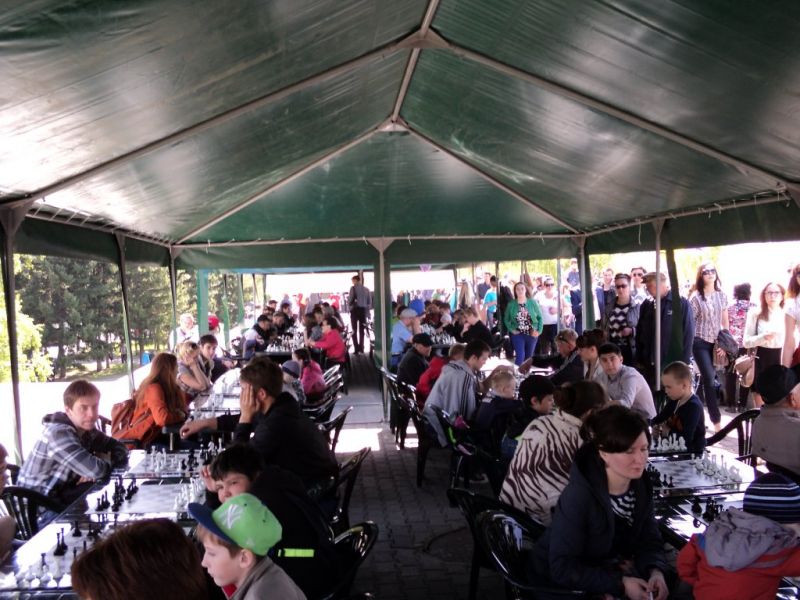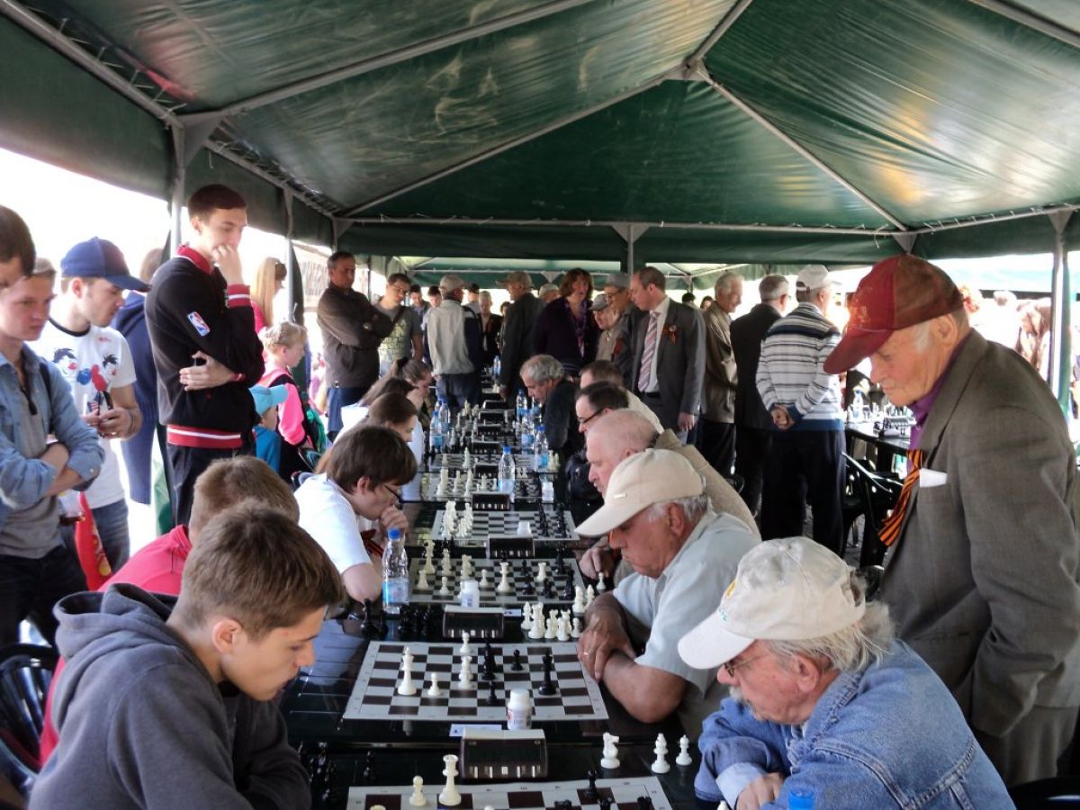 В День Победы напротив краевого театра драмы имени В.М. Шукшина возле городского фонтана силой ума на черно-белых досках померялись 70 ветеранов и 70 школьников. Они сыграли между собой по две партии с переменой цвета. В итоге старшее поколение доказало свое
