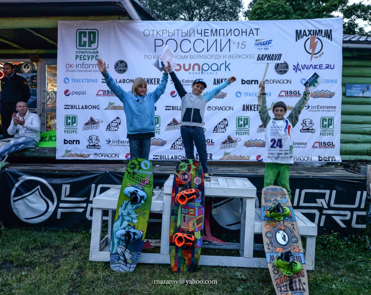 12 лет) третье место занял барнаулец Ермолай Упоров (на фото - с табличкой «Барнаул»). Данил Шестернин и Данил Бабичев из Барнаула заняли шестые места в категориях до 14 и 19 лет соответственно. В итоге команда алтайских экстремалов заняла третье место, уступив хозяевам соревнований и московским вейкбордистам. Это лучший результат для наших спортсменов за всю историю. В прошлом году представители нашего региона на аналогичных соревнованиях были четвертыми.Справка: