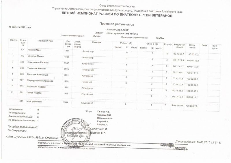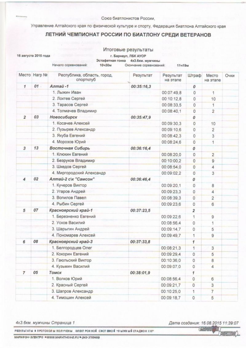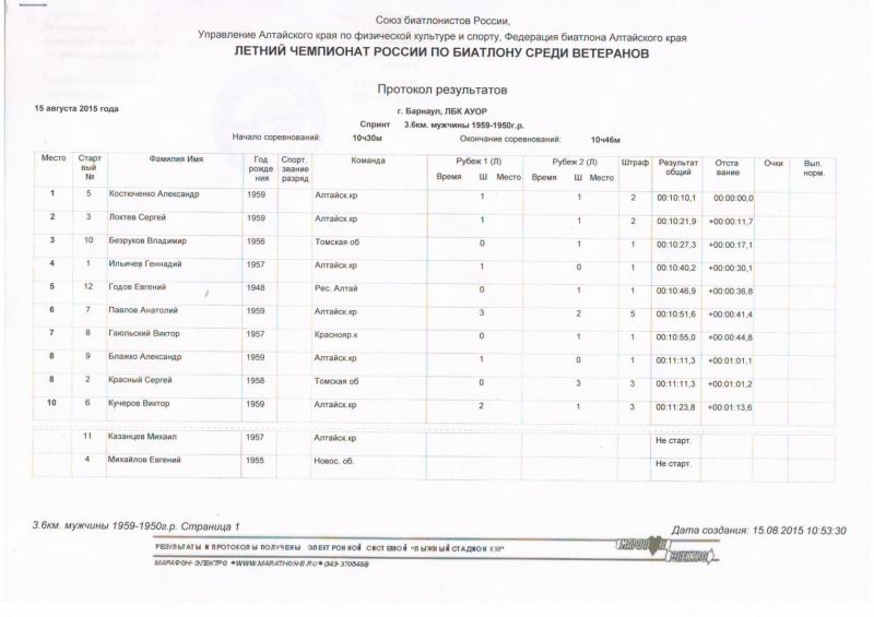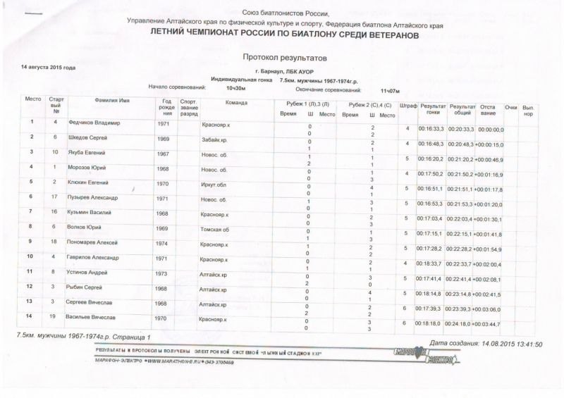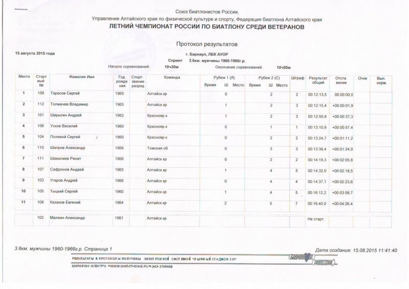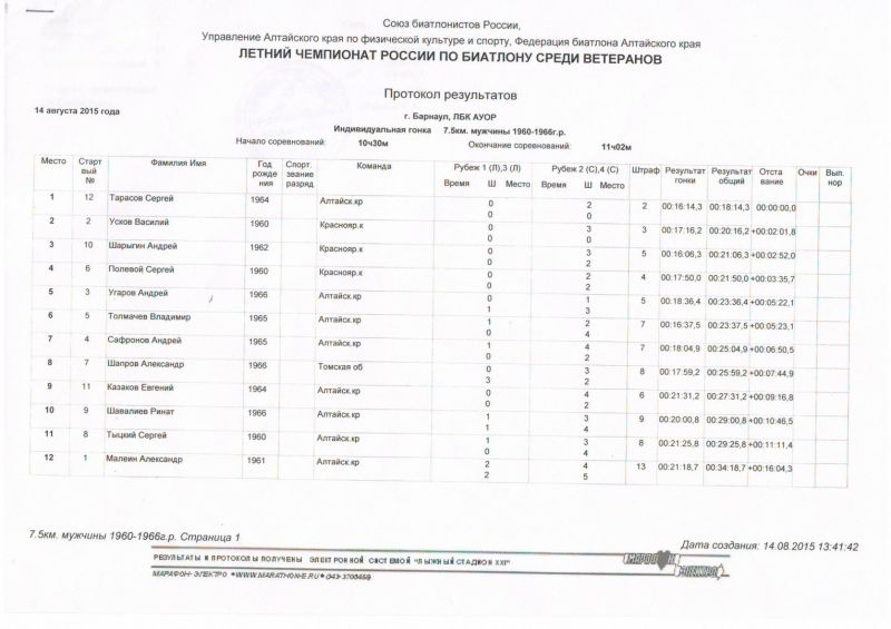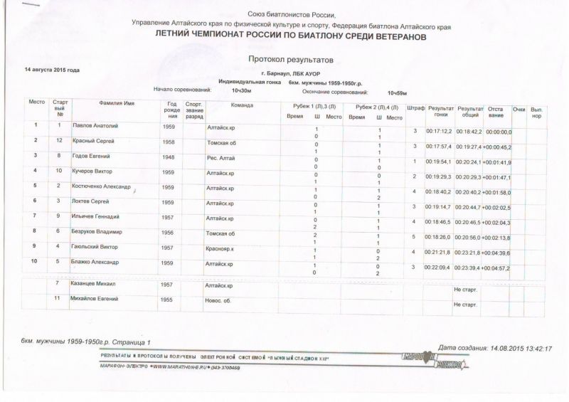 Табло Чемпионат России по летнему биатлону среди ветеранов. Барнаул, л/б комплекс АУОР, 14−16 августа. Индивидуальная гонка 1950−1959 г. р. 1. Анатолий Павлов (Алтайский край) 2. Сергей Красный (Томская область) 3. Евгений Годов (Республика Алтай) 1960−1966 г. р. 1. Сергей Тарасов (Алтайский край) 2. Василий Усков (Красноярский край) 3. Андрей Шарыгин (Красноярский край) 1967−1974 г. р. 1. Владимир Федчиков (Красноярский край) 2. Сергей Шкедов (Забайкальский край) 3. Евгений Якуба (Новосибирская область) 1975−1985 г. р. 1. Иван Лыжин (Алтайский край) 2. Андрей Черкашин (Алтайский край) 3. Алексей Тимошин (Томская область) Спринт 1950−1959 г. р. 1. Александр Костюченко (Алтайский край) 2. Сергей Локтев (Алтайский край) 3. Владимир Безруков (Томская область) 1960−1966 г. р. 1. Сергей Тарасов (Алтайский край) 2. Владимир Толмачев (Алтайский край) 3. Андрей Шарыгин (Красноярский край) 1967−1974 г. р. 1. Вячеслав Сергеев (Алтайский край) 2. Евгений Клюкин (Иркутская область) 3. Сергей Шкедов (Забайкальский край) 1975−1985 г. р. 1. Иван Лыжин (Алтайский край) 2. Павел Вопилов (Алтайский край) 3. Евгений Березненко (Красноярский край) Эстафетная гонка 1. Алтай-1 (Иван Лыжин, Сергей Локтев, Сергей Тарасов, Владимир Толмачев) 2. Новосибирск (Алексей Косачев, Александр Пузырев, Евгений Якуба, Юрий Морозов) 3. Восточная Сибирь (Евгений Клюкин, Владимир Безрков, Сергей Шкедов, Александр Миргородский) Протоколы соревнований доступны в прикрепленных файлах
