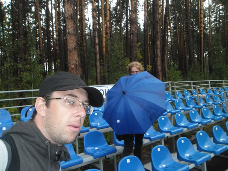 Кстати, места для гостевых болельщиков на стадиончике «Томи-2» располагаются, как и везде, на самом краю трибуны. Только вот расположен этот край почти у средней линии поля. Дальше - лес. Честно говоря, нигде за десять лет выездного стажа мне не предлагали посмотреть футбол с такого удобного ракурса. Из минусов - только металлическая сетка, огородившая поле.